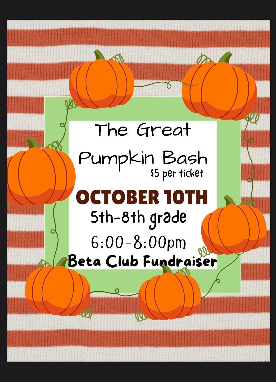 The Great Pumpkin Bash tickets are on sale! The dance will be held this Friday from 6:00-8:00 p.m. for grades 5th-8th. Tickets are $5 and may be purchased from Mrs. Jessica.