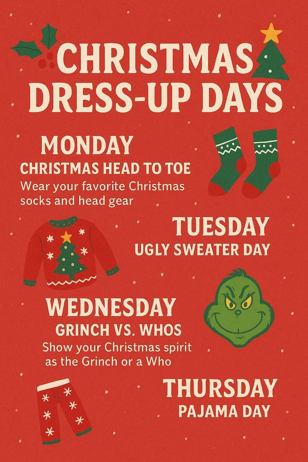 DBS, get ready to spread some Christmas cheer this week with our Holiday Dress-Up Days! We can't wait to see everyone decked out in their Christmas best!!